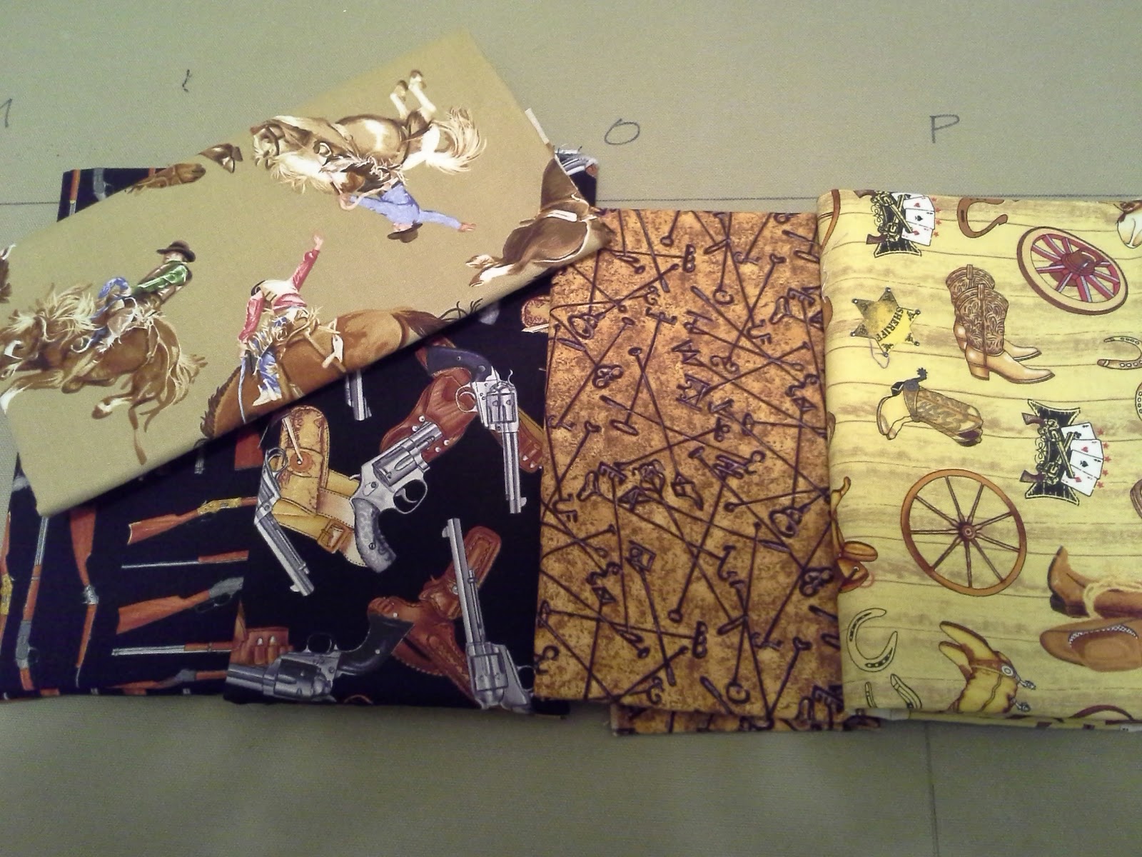 As I'm standing at the cutting counter, I turn around and see a southwestern themed display.  I've been looking for pistol fabric for years, ever since my husband wanted me to make a quilt for a friend from his air gun club.  And look there!  Pistols and rifles.  How about that?  And I live in Texas so everyone wants horses and cowboys.  Aren't those bucking broncos wonderful!  And I've never seen branding iron fabric!  And bonus, I've been looking for a 4.5" wide ruler and they had one of those too.  My frequent buyer card is all full!